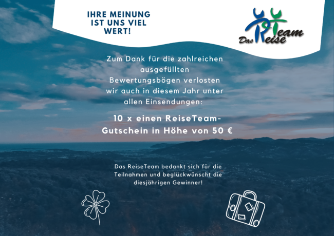 Ein besonderer Glückwunsch geht an die Gewinner unseres Reisegutscheins im Wert von 50 Euro. Unsere Glücksfee hat die Auslosung bereits vorgenommen, und die Gewinner wurden selbstverständlich schon persönlich benachrichtigt.